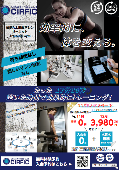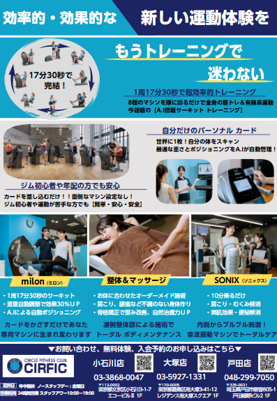 1周17分30秒で、着替えなくてもできるサーキットトレーニングだから忙しい方でもすぐに運動不足解消!